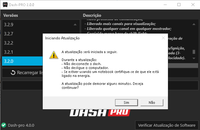 3. Com o Dash Pro em boot , sinalizada pelo LED azul piscando, clique em conectar e na tela inicial busque pela versão 3.3.0 e aperte no botão atualizar.