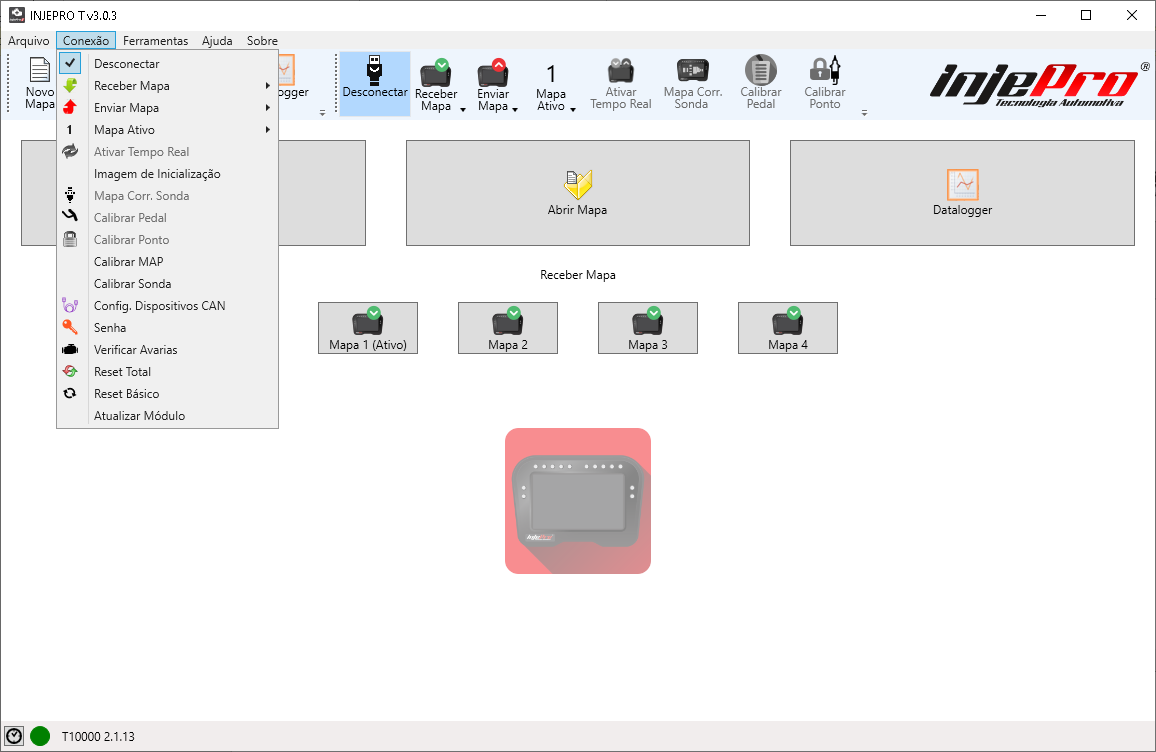 3. Após o software atualizado, agora vamos atualizar o módulo: Abra o software INJEPRO T, conecte o cabo usb, na barra de ferramentas, clique em “Conexão” e depois em “atualizar módulo.