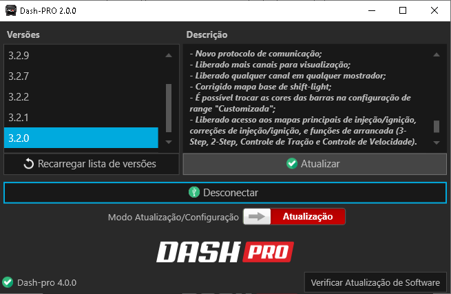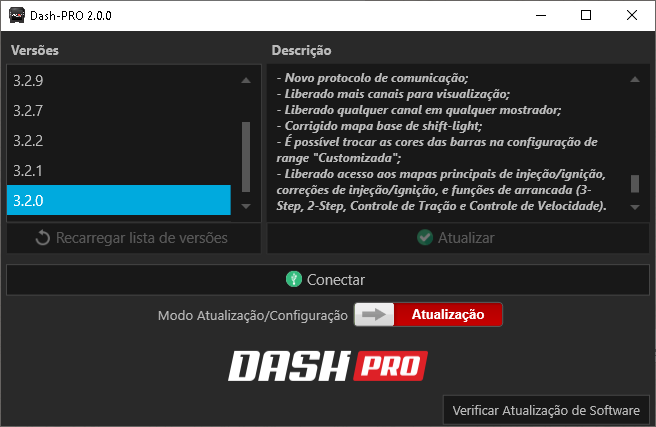 3. Com o Dash Pro em boot , sinalizada pelo LED azul piscando, clique em conectar e na tela inicial busque pela versão 3.3.0 e aperte no botão atualizar.